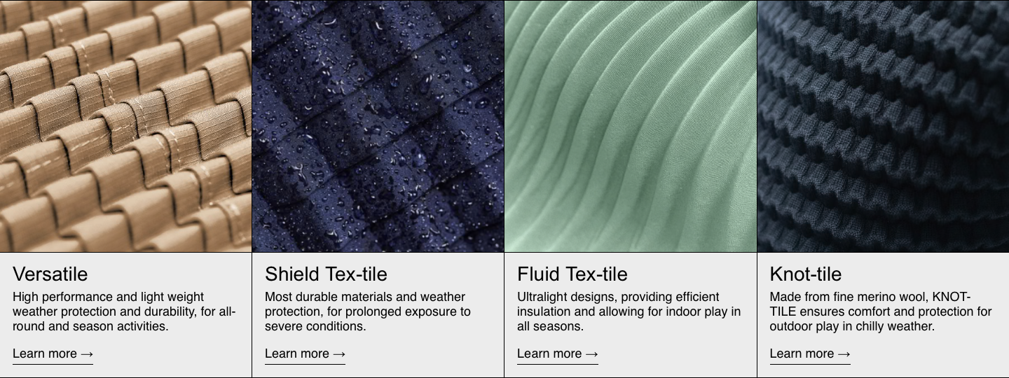 Η μάρκα ξεχωρίζει για την προσεκτική επιλογή ανακυκλωμένων υφασμάτων και τεχνικών υλικών υψηλής απόδοσης, που έχουν επιλεγεί για να αντέχουν στις καθημερινές απαιτήσεις των παιδιών.