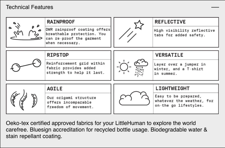 Il sistema di espansione utilizza pieghe nascoste che si aprono e si chiudono in base al movimento e alla crescita, consentendo ai capi di cambiare forma senza perdere vestibilità o comfort. Questa tecnologia permette di accompagnare i bambini dalla nascita fino ai nove anni di età attraverso tre collezioni dedicate: TinyHuman (0-12 mesi), MiniHuman (9 mesi-4 anni) e LittleHuman (4-9 anni), riducendo la necessità di acquisti frequenti e promuovendo una nuova idea di abbigliamento adattabile e sostenibile.