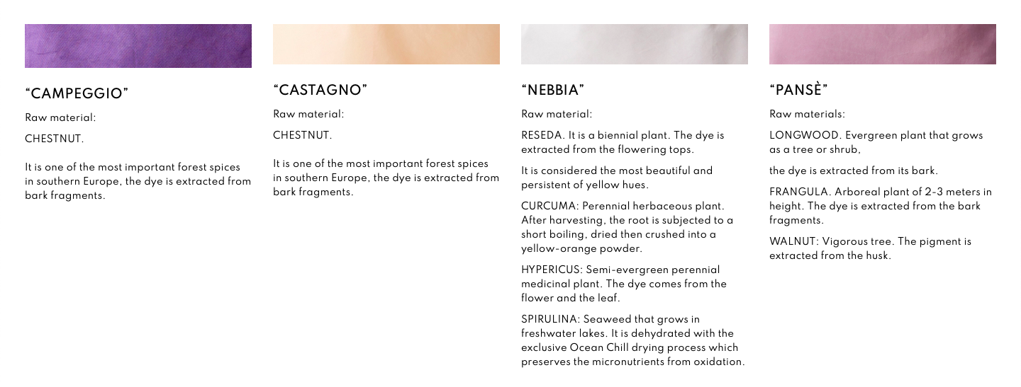 Σε συνεργασία με την Phillacolor, η μάρκα χρησιμοποιεί μόνο φυσικές βαφές για τη βαφή υφασμάτων, εντελώς απαλλαγμένες από τοξικές ουσίες, φυτοφάρμακα, νιτρικά άλατα ή συντηρητικά.