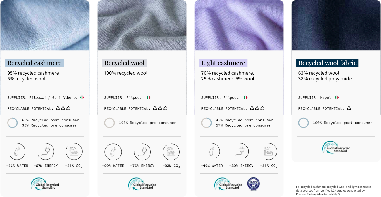 Η προέλευση των υλικών επαληθεύεται μέσω προμηθευτών πιστοποιημένων κατά GRS (Global Recycle Standard), οι οποίοι εγγυώνται την προέλευση του αναγεννημένου κασμίρ, ενώ τακτικοί έλεγχοι του νήματος διασφαλίζουν την καθαρότητα και την ποιότητά του. Αυτή η προσέγγιση επιτρέπει την ανάπτυξη μιας διαφανούς διαδικασίας παραγωγής, με εβδομαδιαία παρακολούθηση σε ολόκληρη την αλυσίδα εφοδιασμού.