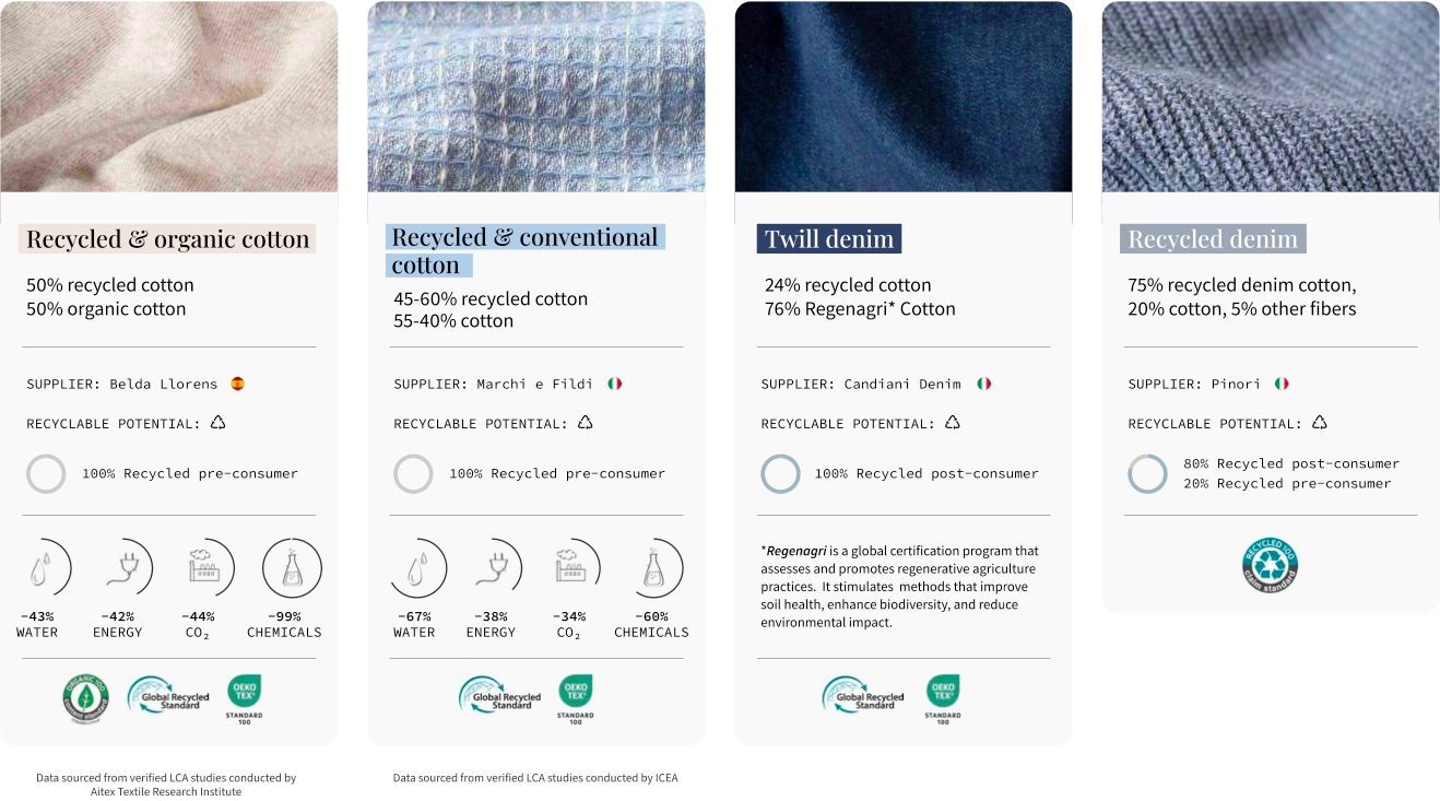 Each yarn is designed as a single material or with a minimal percentage of blending in order to preserve recyclability in future life cycles.